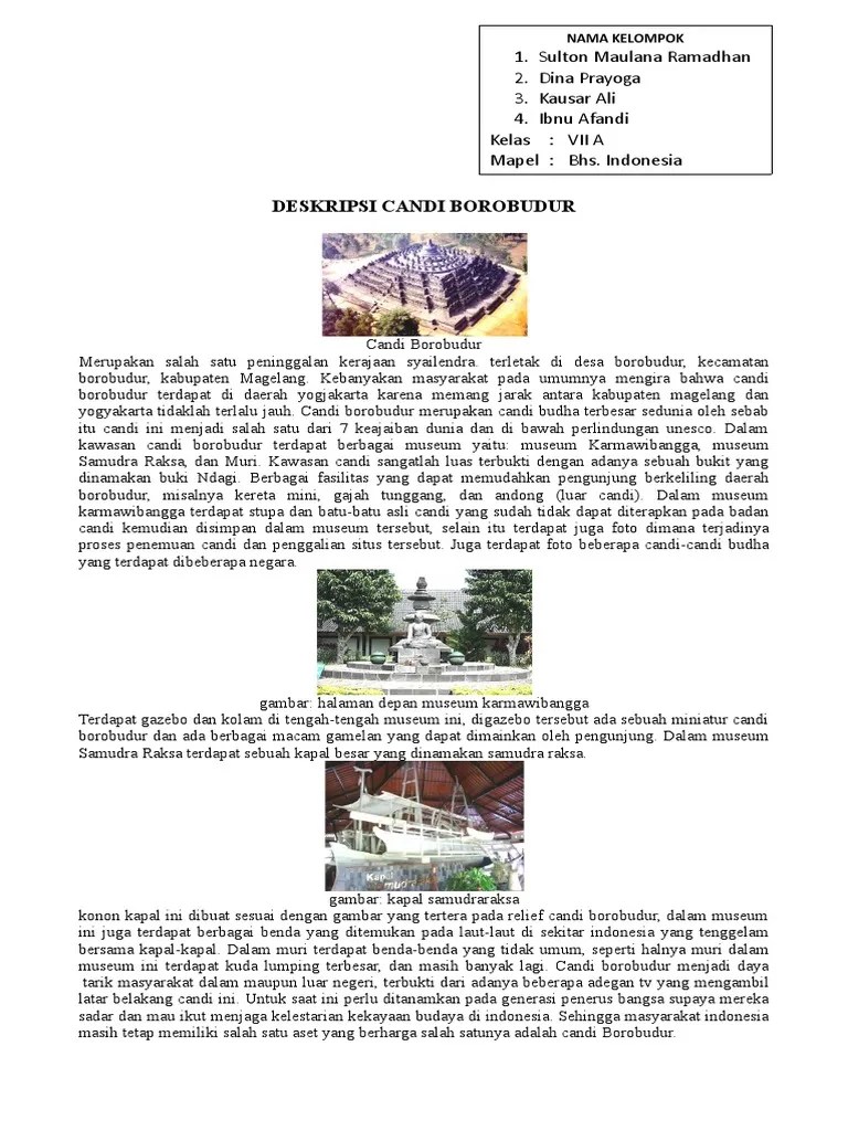 Hal ini dikarenakan judul teks tersebut tidak memfokuskan kepada deskripsi candi borobudur, melainkan hanya kemegahan candi borobudur saja. Kemegahan candi borobudur berdasarkan judul teks tersebut, dapat diketahui bahwa judul tersebut bukan merupakan judul dari sebuah teks deskripsi. Contoh deskriptif text candi borobudur. 8 contoh teks deskripsi tentang benda. Banyak candi perwara yang belum dipugar, dari 224 candi perwara hanya 2 yang sudah dipugar, yang tersisa hanya tumpukan batu yang berserakan.