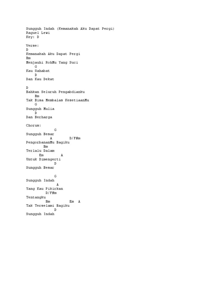 Sungguh mulia dan berharga sungguh besar Menjauhi rohmu yang suci kau sahabat dan kau dekat bahkan seluruh pengabdianku tak bisa membalas kesetiaanmu. Ke manakah aku dapat pergi? Kau sahabat dan kau dekat. C kemanakah aku dapat pergi. Bagikan lagu ini ke temanmu agar mereka terberkati. Chord sungguh indah (raguel lewi) bait : Kau sahabat dan kau dekat. Kau sahabat dan kau dekat. Kemanakah aku dapat pergi bm menjauhi rohmu yang suci g kau sahabat d dan kau dekat d bahkan seluruh . Aku dapat pergi am menjauhi rohmu yang suci f kau sahabat c dan kau dekat. Verse1 a kemanakah aku dapat pergi f#m menjauhi rohmu yang suci d kau sahabat e dan kau dekat verse2 a bahkan seluruh pengabdianku f#m tak bisa membalas . Kau sahabat dan kau dekat.